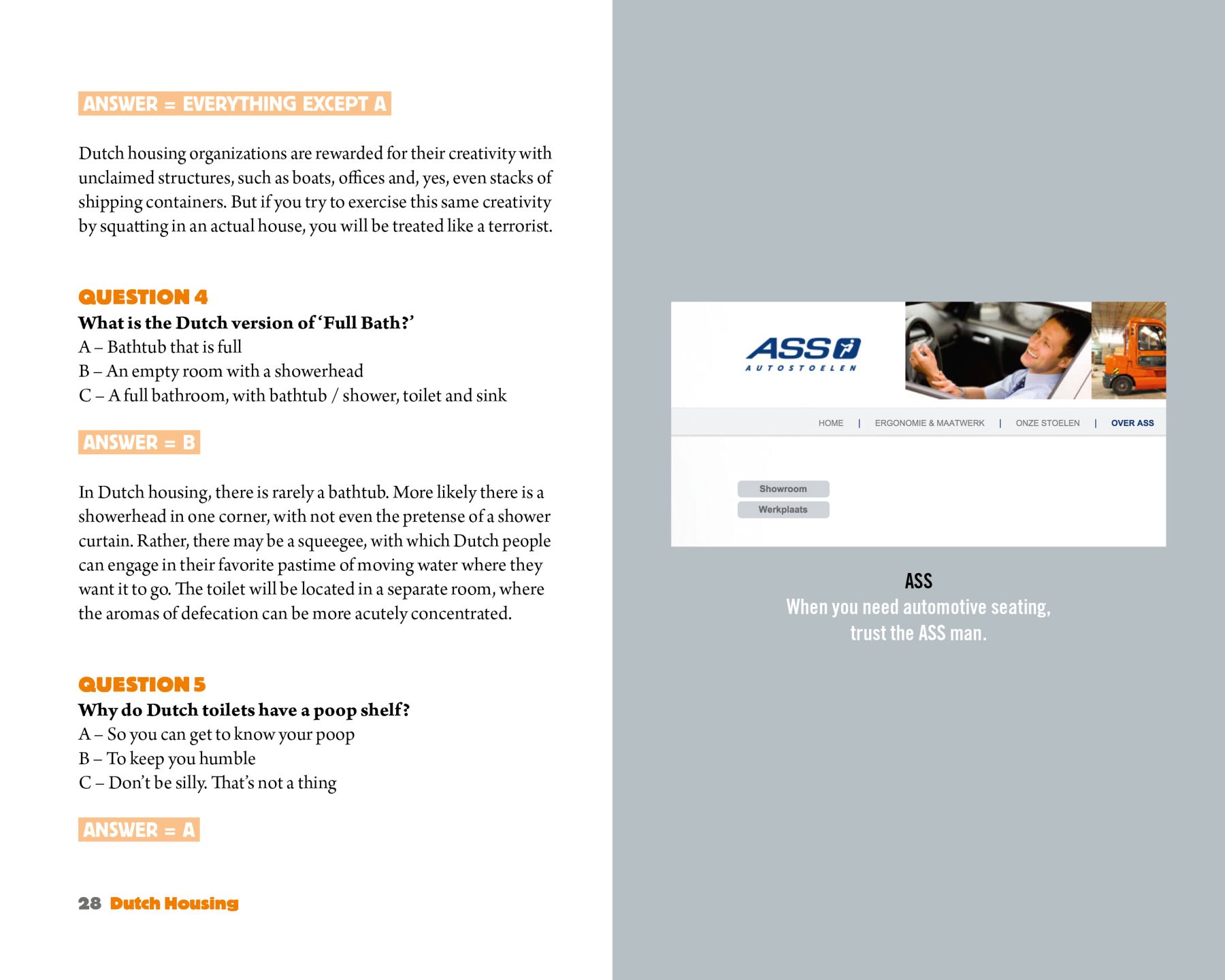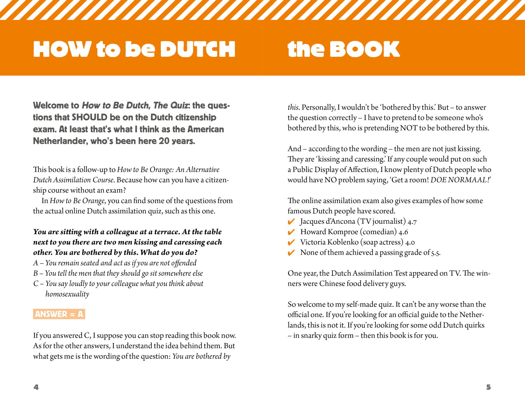 If you’re looking for an official guide to the Netherlands, this is not it. But if you’re looking for some odd Dutch quirks – in snarky quiz form – then this book is for you. If you want to take the official Dutch exam, you can do it online. You can also see the results of many famous Dutch people who’ve taken the exam – and failed. So welcome to this self-made quiz. It can’t be any weirder than the real one.